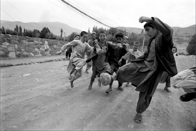 August 2001: Boys playing soccer with a deflated ball in the town of Faizabad in the Northern Alliance-controlled