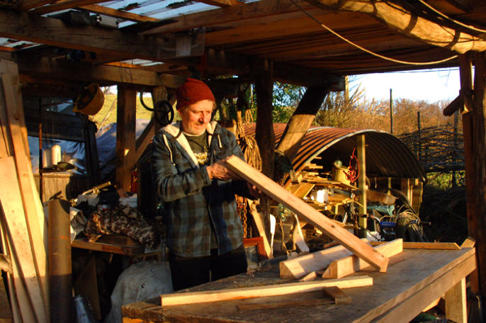 Evening sun striking the face and endevours of a Tipi Valley carpenter whose open sided wood work shop faces south.