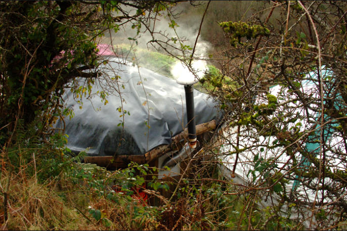 Pausing for breath. A Tipi Valley resident up-cycles found objects into a polytunnel, just in front of his tipi.