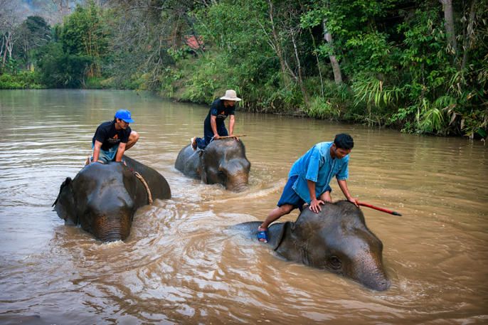 Mahouts give elephants a morning bath at Anantara Golden Triangle Elephant Camp & Resort, near Chiang Rai,