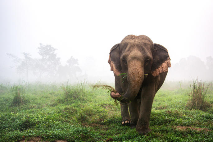 Elephant and early morning fog at Anantara Golden Triangle Elephant Camp & Resort, near Chiang Rai, Thailand.
