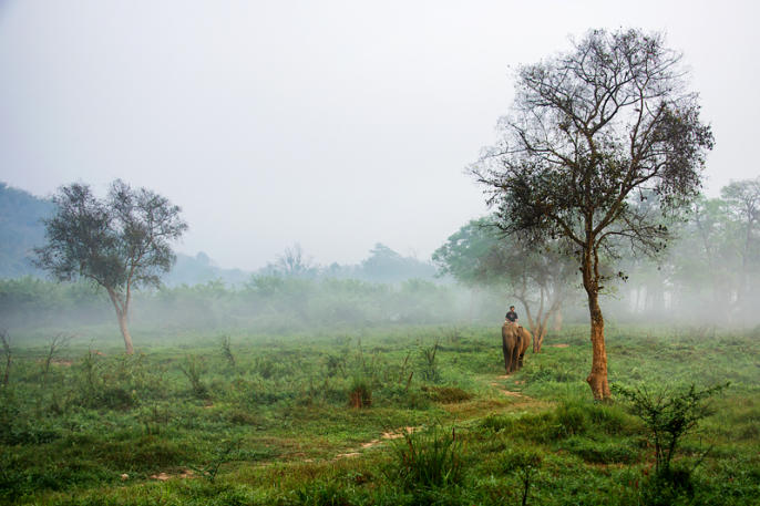 Elephant and and mahout in the early morning fog at Anantara Golden Triangle Elephant Camp & Resort, near Chiang