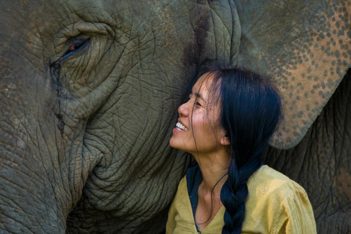 Lek Chailert with one of her elephants at Elephant Nature Park, Chiang Mai, Thailand.