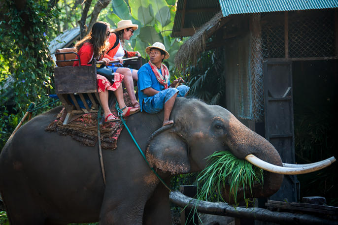 Tourists ride an elephant at Maesa Elephant Camp in Chiang Mai, Thailand.