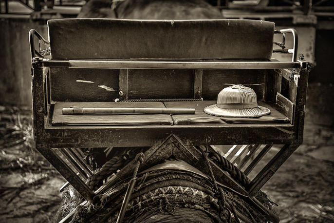A heavy seat used to give tourists rides, bull hook and hat await a mahout at Maesa Elephant Camp in Chiang Mai,
