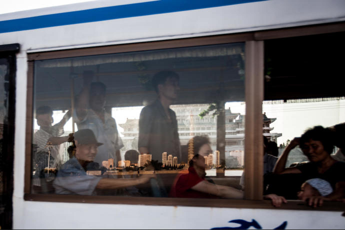 With the Grand People's Study House in the background, the window of a bus reflects the Juche Idea Tower.