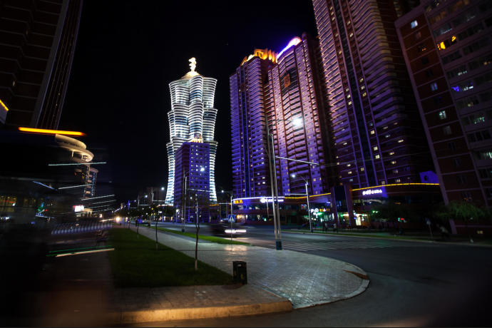 Downtown Pyongyang buildings lit up at night. Sustained aerial bombing by the US Air Force during the Korean war
