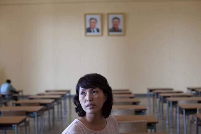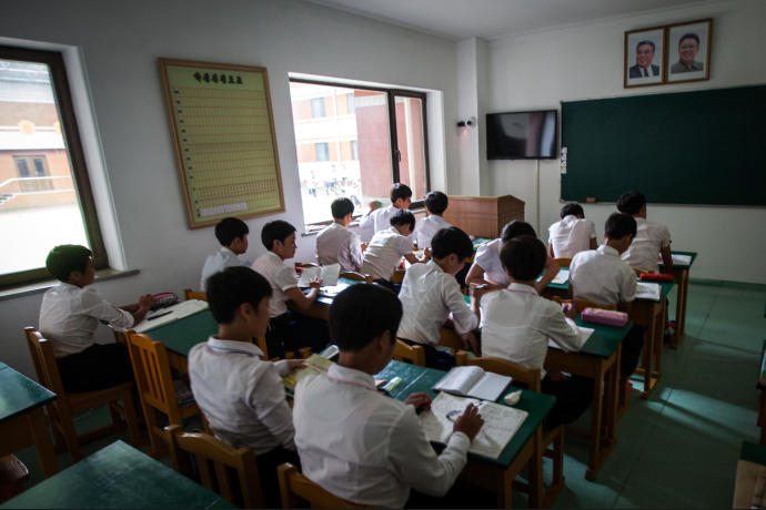 Portraits of Kim Il Sung and Kim Jong Il in a classroom of children in Pyongyang, North Korea.
