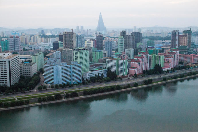 A view across the Taedong river from the Yanggakdo Hotel in Pyongyang. High-rise buildings are pastel-coloured, the