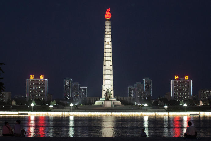The Juche Idea Tower and surrounding building in Pyongyang are lit up at night. The backbone of North Korean