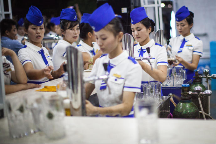 Waitresses at the Pyongyang beer festival serve pints for locals and tourists alike.