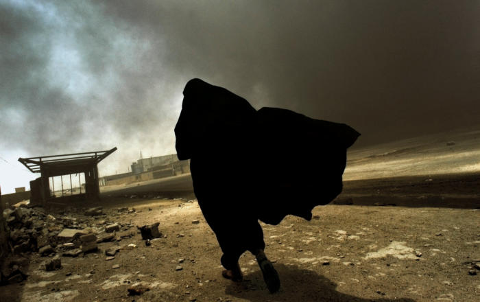 An Iraqi woman walks through a plume of smoke rising from a massive fire at a liquid gas factory as she searches