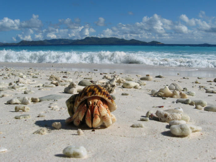 Orange hermit crab Aride’s south-facing beach provides egg-laying sites for green and hawksbill turtles, the sand-