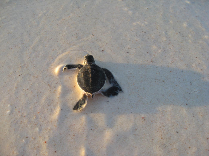 Green turtle hatchling on the way to the sea.