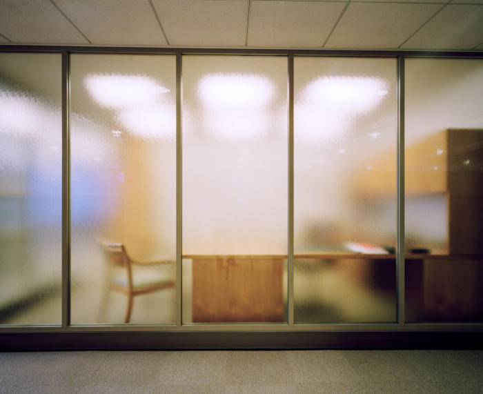 computer monitors and the cold glow of the Xerox machine; what