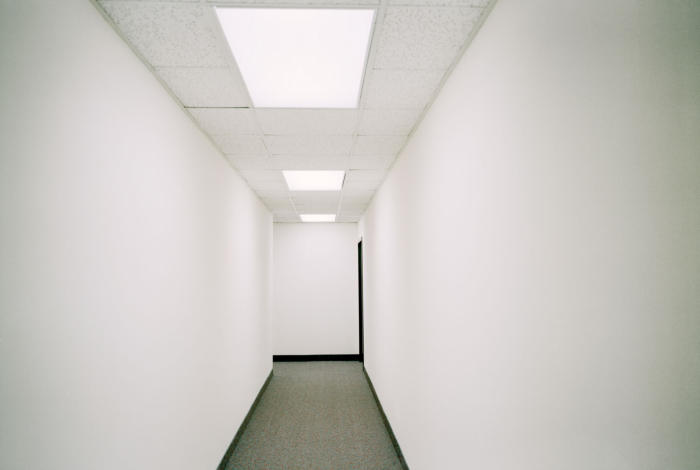 Teetering stacks of paper, off-kilter filing cabinets, gum-white