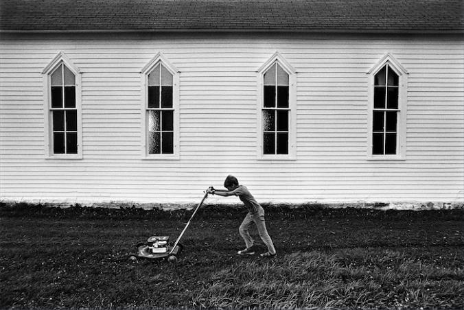 Mowing the lawn at St. Isadore Catholic Church, Cuba, Kansas.