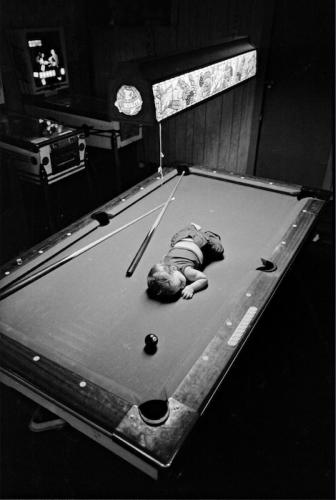 Asleep on the pool table in the Lazy B Bar, Cuba, Kansas.