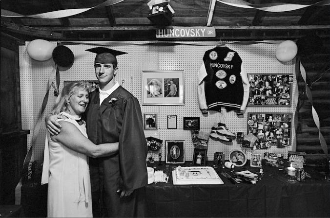 Graduating senior and his mother in the garage, Cuba, Kansas.