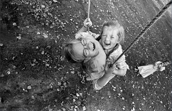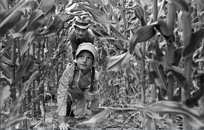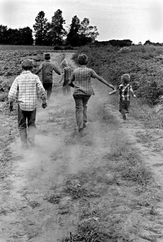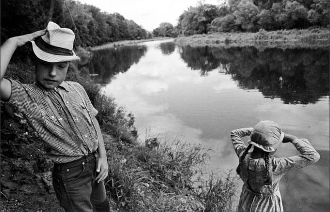 Brother and sister play by the river on their farm in St. Jacobs, Ontario.