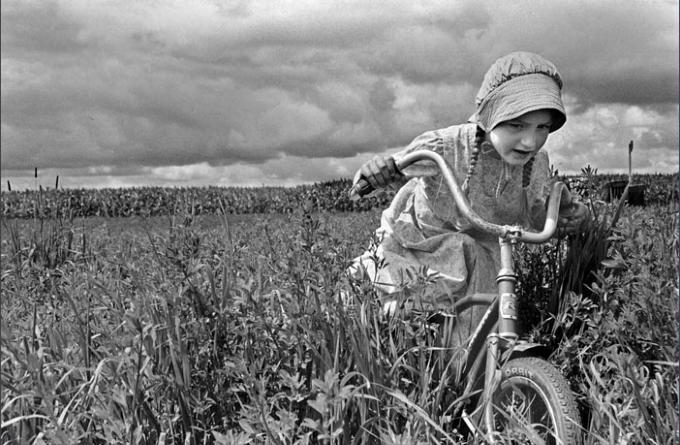 A Mennonite girl pushes her old bicycle through a field to get home.