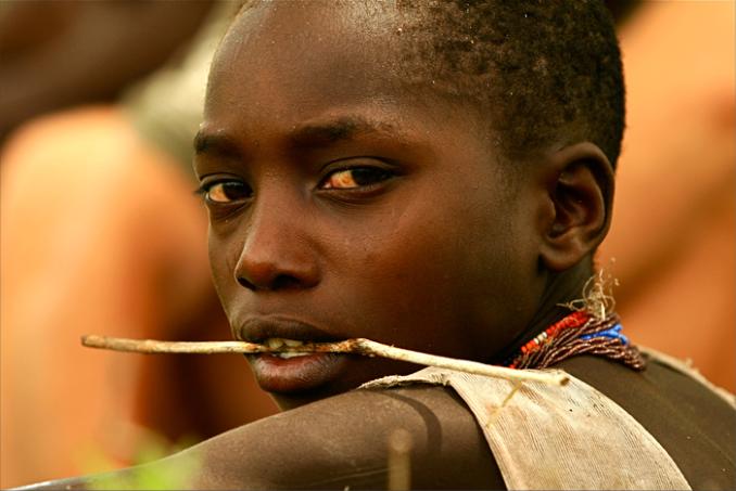A young Hadza boy eats a honeycomb seconds after it has been removed from a hive. Picture © Joanna Eede