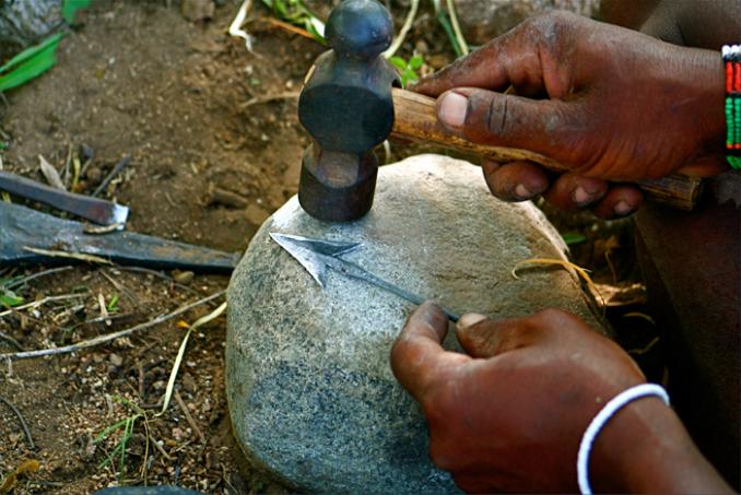 Metal from nails is hammered and shaped into arrow-heads, and the sap of the desert rose shrub used to coat the