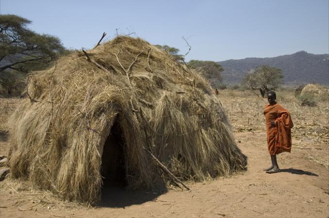 The Hadza make huts by bending tree branches into round structures, and covering with grass.