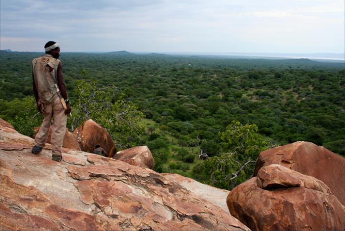 On top of Mukelengeko, a rocky outcrop that is one of the Hadza’s most important ritual sites, Gonga looks out over
