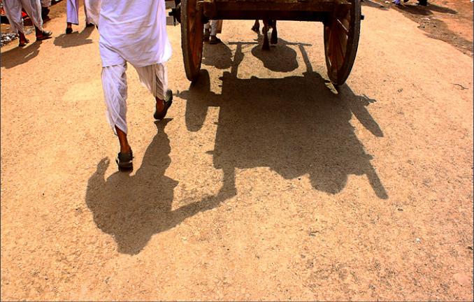 An old man walking in the harsh afternoon sunlight with a bullock-cart carrying his family to the holy town of