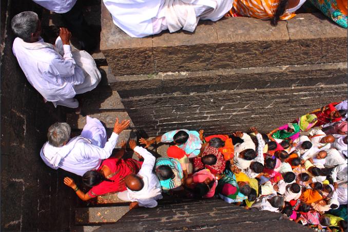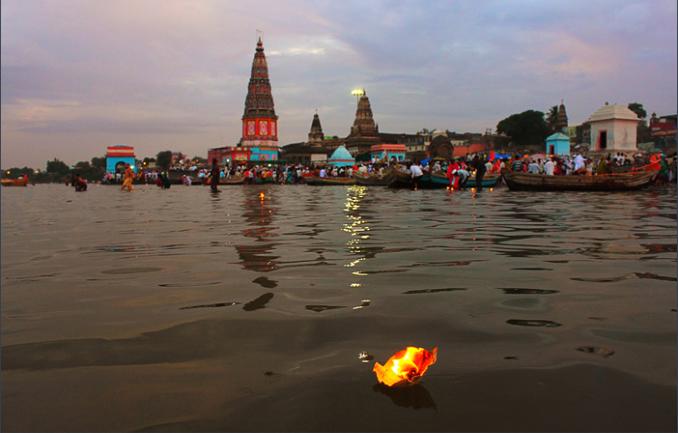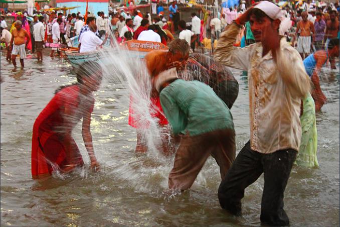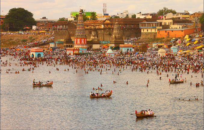Pilgrims gathered for a bath at the holy river Chandrabhaga at Pandharpur. It is a tradition to bathe before pilgrims