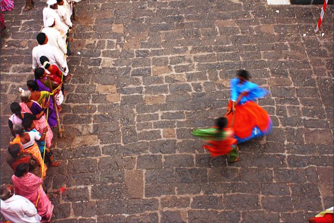 Two women performing Fugadi, a traditional dance in Maharashtra at a temple at Gopalpur, 2 km from Pandharpur.