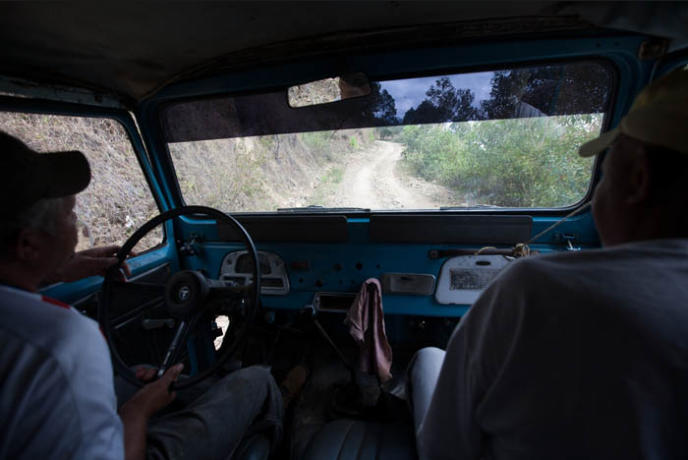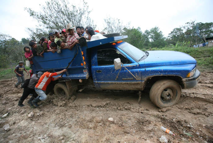 A truck of coffee pickers struggles up a muddy path at CARSBIL. CARSBIL is a Fairtrade-certified coffee producer in