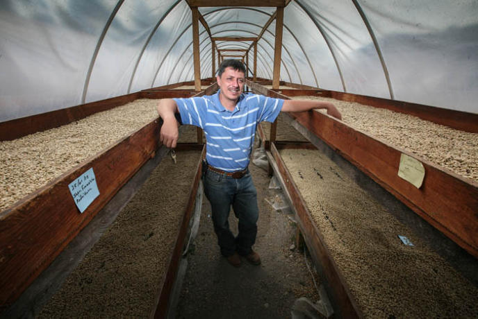 Carlos Humberto Andrade Rosa, in charge of drying at the coop. COPROCAEL, Cooperativa De Productores De Café