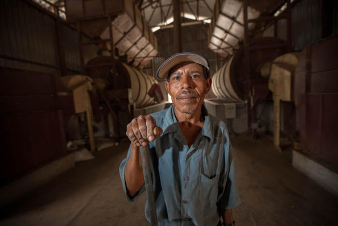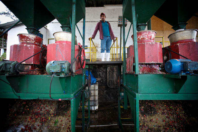 A worker attends the depulping machines at COMSA. COMSA, Café Orgánico Marcala, is a Fairtrade-certified