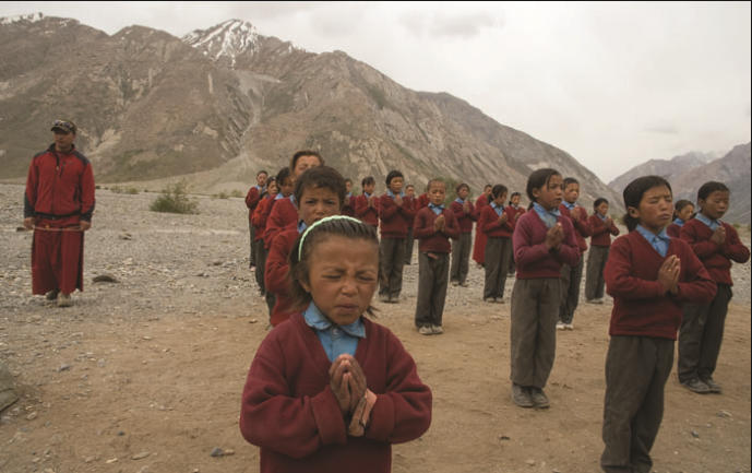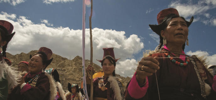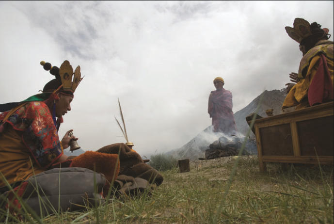 A Buddhist monk and a Tibetan witchdoctor perform a ritual to usher well-being into the valley.