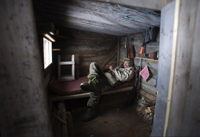 With a hunting cabin as his starting point and his dogs as his assistants, he follows the