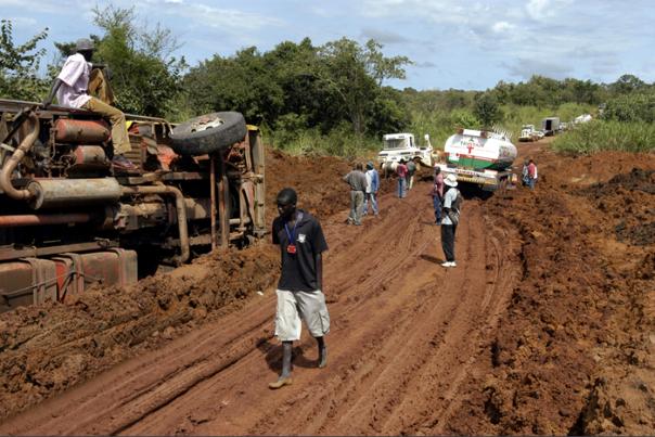 Transport vehicles overturned and stuck in the mud along a road washed out by rains in Central