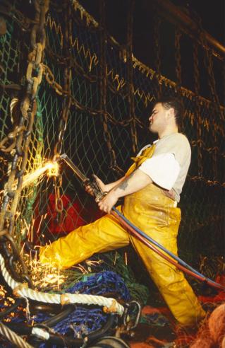 The crew work together all hours of day and night and their job is not only to work hard catching fish and mending