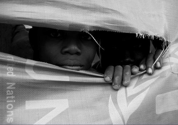 A boy hiding behind plastic sheeting from the UN High Commissioner for Refugees, south-western Guinea,