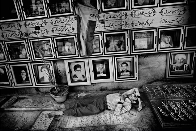A man sleeps in the graveyard in central Qom, outside the Fatima sacracy. The pictures show martyrs from the