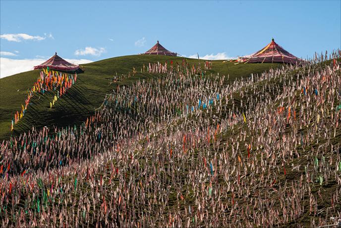 The hillside above the Segyagu Meditation Center is obscured by thousands of flags, which send prayers to the winds