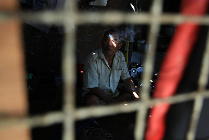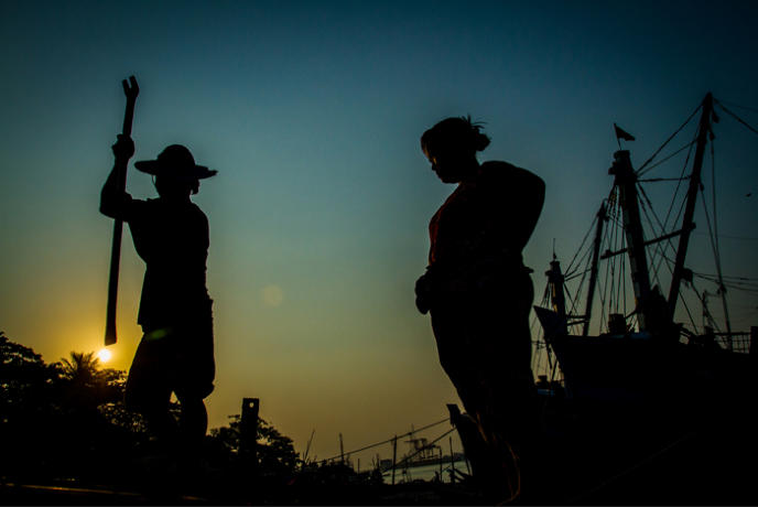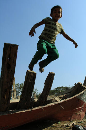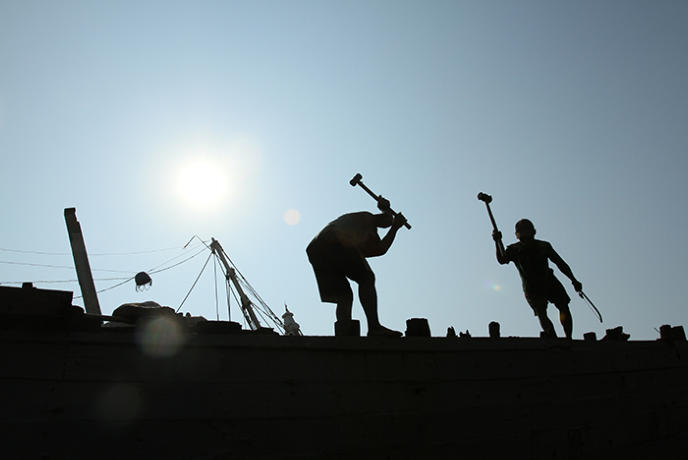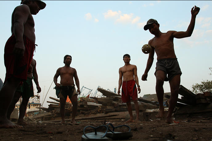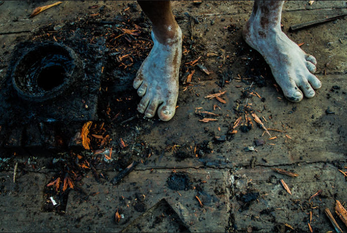 The feet of a worker standing on the floor of a wrecked ship says something about his hard life.