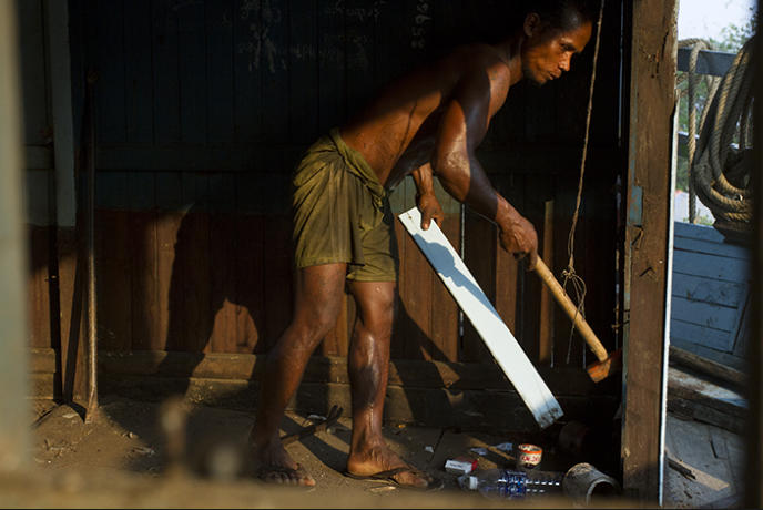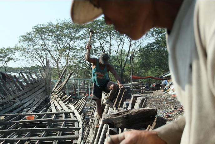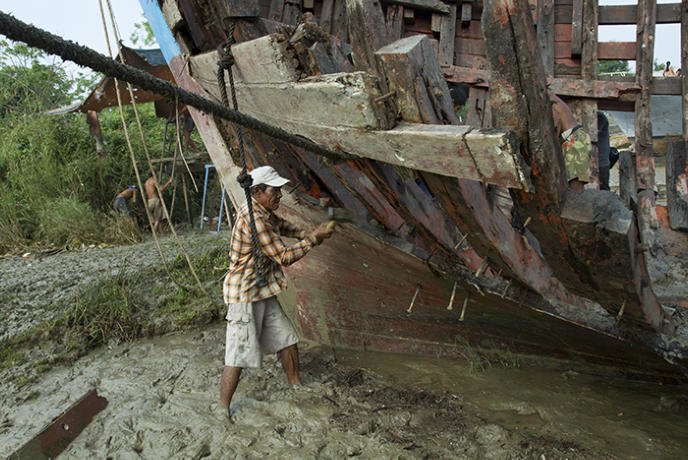 These images were taken at a privately-owned work site where wrecked ships are dismantled and mended in Dala Township, in Myanmar. The owner buys wrecked ships and extracts the usable materials for resale. Timbers may bereused for making furniture or building houses for example. The average wage of the workers is just $4 US. There are no health and safety restrictions or guidelines and if workersare injured, there is no compensation or insurance.