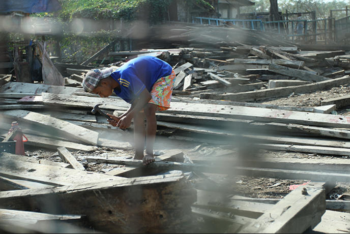 Retaking the usable lumbers from ribs of a wrecked timber ship for recycling.