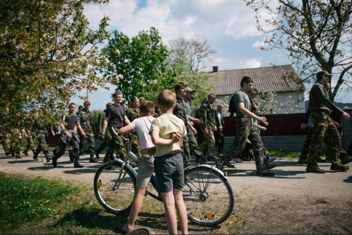 Two kids observe the paticipants of the Gurba-Antonivtsi game walking the to cemetery to pay respect to Olexandr