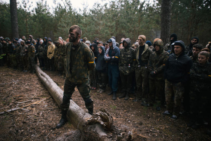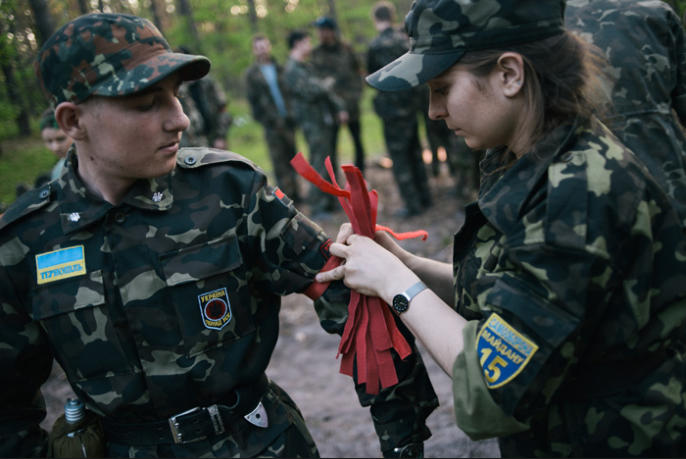 A girl (with the 15th self-defense unit of Maidan logo) places the red velcro strap on the arm of a participant, which