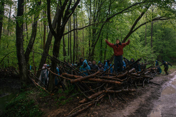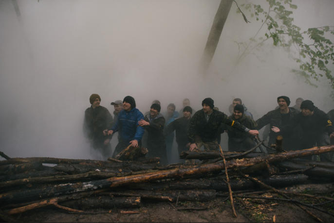 Players of the yellow team build a barricade "like Maidan" to defend their flag. Smokebombs are usually used during