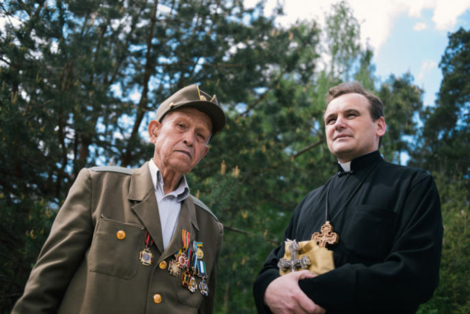 Vasul' Kuruliyk, 88, a veteran of the battle between UPA and Red Army and a priest during the ceremony to remember