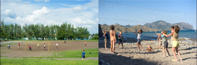 right - Children playing volleyball on the beach. Crimea, Ukraine.